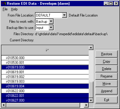 to regenerate them. When restoring EDI data, the system attempts to lock the input or output directory, as well as the backup directory for the file location specified.If it cannot, you will be asked whether or not you want to continue to attempt to restore the files selected. If the input file for the file location contains wildcard characters, then the system will prompt you for the file name to use to restore the backed up files to. The system will ensure that the file name entered is valid, and that the files that are to be restored in the appropriate directory. |