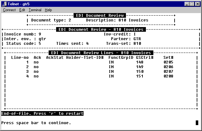 Another feature is the ability to view all Functional Acknowledgments received for a single outbound document. Multiple F/A's will be sent by your partner when the F/A document is sent more than once (for a resend, for example). To view the F/A's choose the document, press "Z" for Zoom and choose item 9 (Document Review lines). You can do this from the Summary or Detail (illustrated below) Review screen.