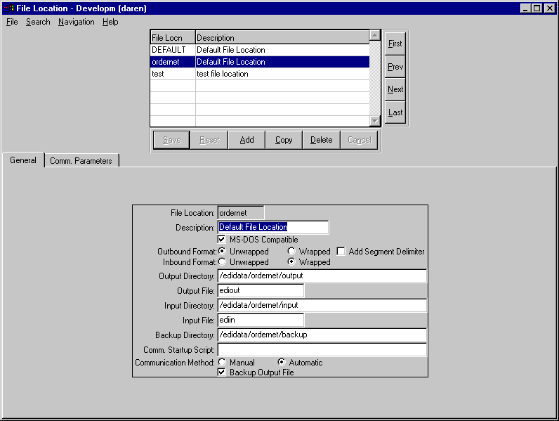 Use this function to create and maintain the file locations used when receiving or generating EDI data. File locations are used to allow you to send and receive EDI data from multiple Value Added Networks (VAN's)or trading partners.