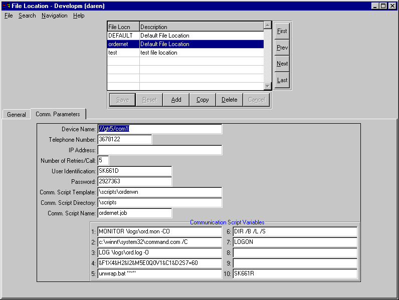 The system uses a communications script template and the data in this file to build a communication script. The script template and script will be stored in the directory defined in this file. We have developed templates for most major VAN's (e.g. Ordernet, IBM/Advantis, Geis, Harbinger) and for some of the auto makers (e.g. Ford, Chrysler, GM). Should you be using another VAN we would be glad to develop the template for you.