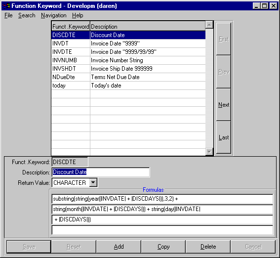 Function keywords are similar to database keywords. The difference is that a function keyword is a formula. When encountered in a calling formula the function will be executed and a result will be returned to the calling function. Functions can also call other functions as long as they do not call themselves (recursive).