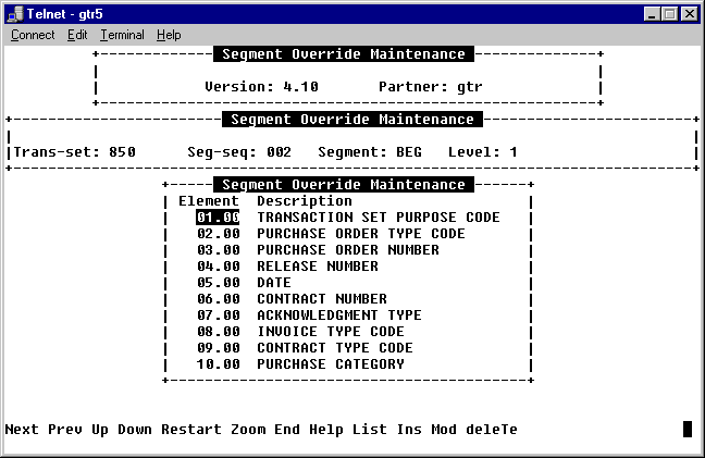 A browse frame will then appear listing the elements that are used by a particular segment. Use the |UP/DOWN ARROW| keys to go between data elements. Choose a data element to work with and hit enter. You will then be presented with the next frame: