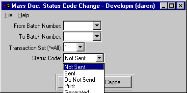 | Doc-match | Enter "*" to change the status code for all document types, or the digit(s) of the document type or types desired (e.g., to change the status code for only picking slips and invoices, enter "12" in this field). At present, these document types are supported. | ||||||||||||