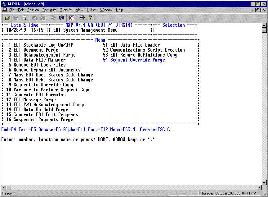 This menu contains functions that are used intermittently, such as purges and batch processes. Click on the menu item to learn more about each item. Some of the items have already been explained in relation to their corresponding functions within some of the other menus.