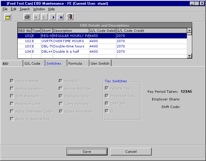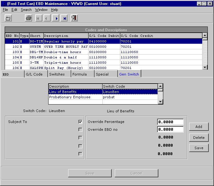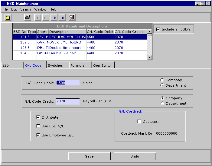 The Use EBD G/L and Use Employee G/L control which G/L code to use when recording salary (expense) information. Since we can override the expense G/L on the employee master we have the option to decide which G/L is to be used for salary information when using a particular EBD. For example if we have an EBD with a G/L code of 1224, we may set up the employee with a G/L code of 1234. Since an employee can accrue salary across multiple pay categories (EBD's) we must define when to use the G/L code from the EBD and when to use the employees G/L code. This feature allows for maximum flexibility when setting up the G/L.