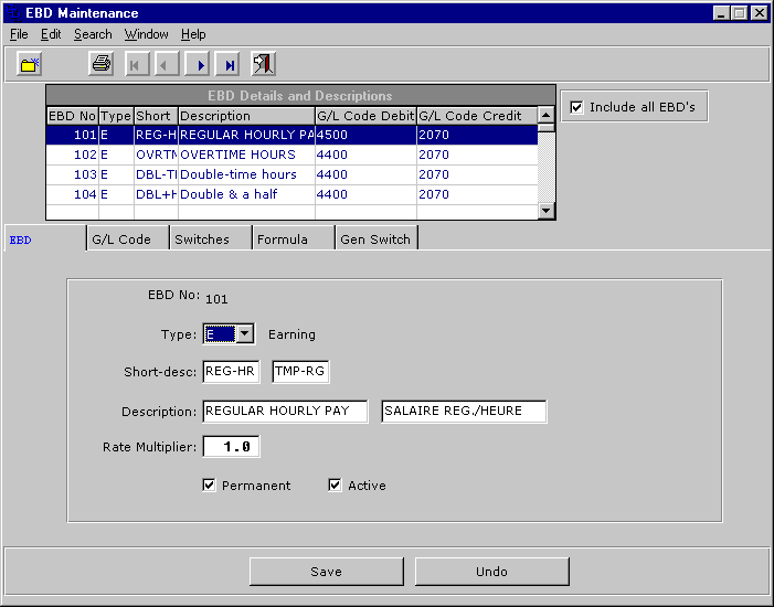 EBD's are used throughout the payroll system for keeping track of earnings, benefits (taxable and/or non-taxable), deductions, employer shares etc. This allows the software to keep track of every financial transaction that occurs in a pay cycle. The EBD is assigned to the employee in Employee Maintenance or Fixed Deduction Maintenance. Not all EBD's need to be assigned to the employee. In general a deduction category that you create needs to be assigned to an employee so that the system knows how to perform the deduction. Statutory EBD's (for federal and provincial taxes in Canada, and Federal, FICA, Medicare in the U.S.) are assigned by the system and need not be assigned to the employee, unless you want to deduct more or less for that employee. For more information about this see the Employee and Fixes Deduction Maintenance.