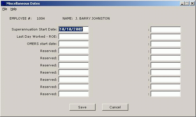 This screen allows you to enter miscellaneous dates associated to the employee record. The labels for these fields are user defined and can be defined via the system table entry EMPL-L-Date. Twenty fields are available; 1-10 are reserved and 11-20 can be used for any other fields.