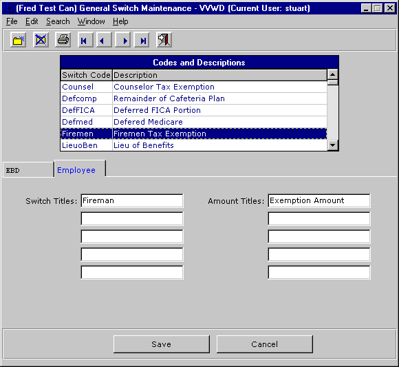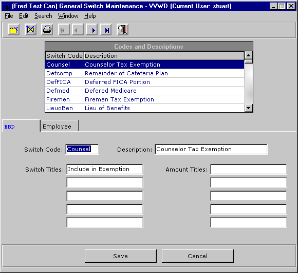 The next screen does the same thing only this time for an employee switch. Note that in this switch we are using 2 titles. This switch will be used in the Employee General Switch Maintenance.