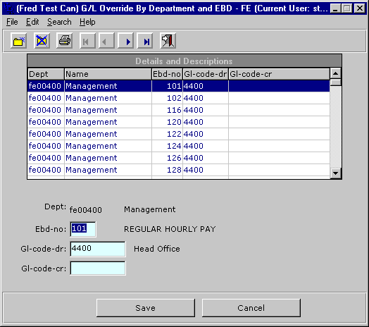 This file can be used to override the G/L codes for an EBD within a department. Please see the topic G/L Coding Theory for more information about how the information from this file is used for determining a G/L code. To create a new record just click on the add button and enter the department and EBD. Then enter the G/L codes associated with the override.