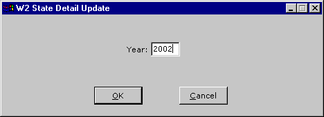 Before printing W2's you must run the W2 State Detail Update. This program will ensure that all the State information and withholding tax is properly recorded on the W2. Enter the year and click OK.
