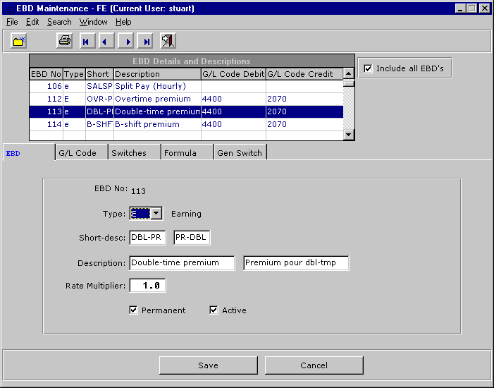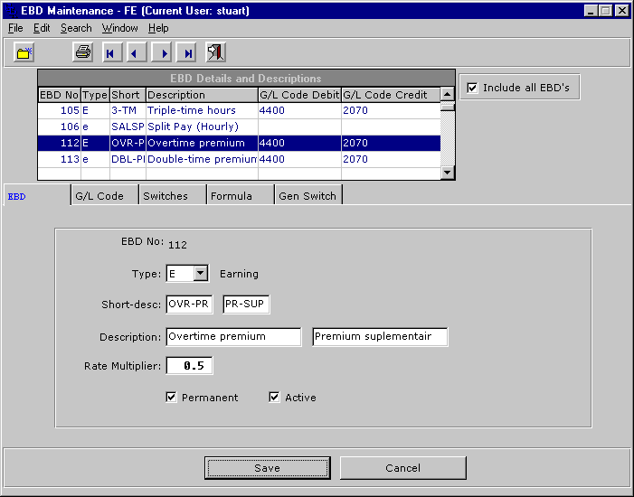 3. Create the overtime and double time premium EBD's. These EBD's will be used to record the premium costs. The Rate Multiplier should be set to .5 for overtime and 1.0 for double time. In our example we have created EBD 112 for overtime premium and 113 for double time premium.