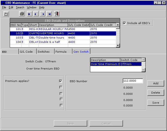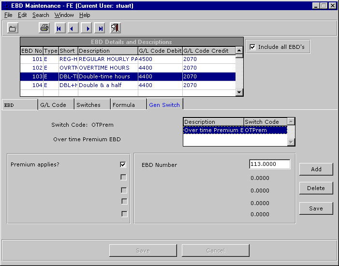 4. Link EBD 102 (overtime) and 103 (double time) to the newly created premium EBD's via the EBD general switch. Ensure that the Premium applies switch is clicked on: