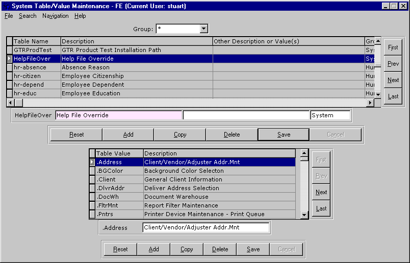 Another function of the system table could be to provide information to the software. For example this system table provides information to the Help system. The values in this table would be assigned by GTR personnel whereas the values in the preceding table would be created and maintained by the end user.