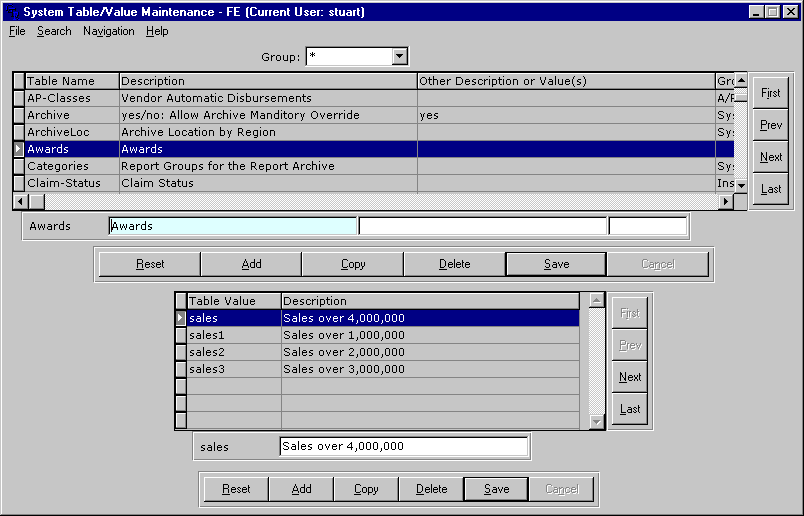 Once this table is created it can be used as a lookup when assigning awards to employees. Only the values sales, sales1, sales2, or sales3 will be valid within the context of an employee award.
