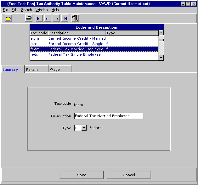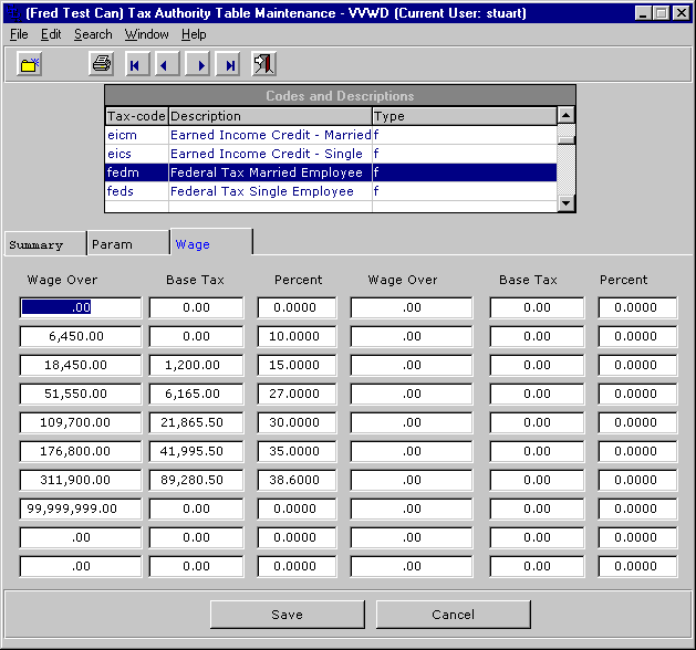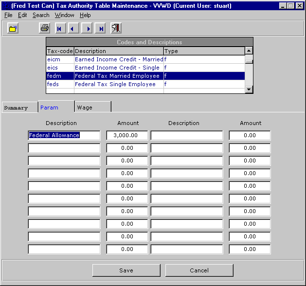 This screen has 20 slots for misc tax information pertaining to the authority chosen. In this case the first parameter slot is the Federal Allowance. Browse through the file to see some of the other uses for these parameters. The only field that you will ever change is the value. The system looks at these values when doing its tax calculations so moving them around is not an option. See the Tax Method topic for more information about Parameter 10.