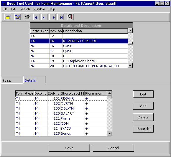This function is used to define the contents of the boxes on the tax forms (Canada - T4 & Releve 1, US - W2). Each box has an entry in this file that will contain a list of EBD's that are associated with that box. In the screens below you will see the contents of box 14 defined.