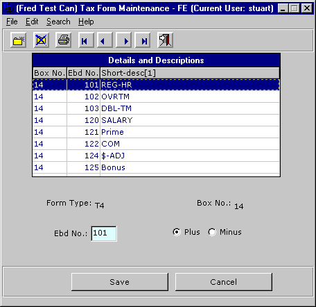 When you receive the software all the EBD's that are provided with the system will be defined as belonging to a particular form box. If you add new EBD's it is your responsibility to ensure that the EBD is properly accumulated to the correct box. For example, if you add a new EBD for earnings then you must add that EBD to the appropriate earnings box for the form. In our example below you would add the new EBD to box 14.