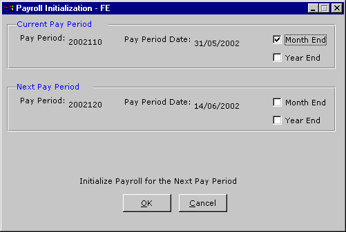 The frame below shows what the initialization screen looks like when run. Click yes if all the information is correct. The pay period information is retrieved from the pay period file.