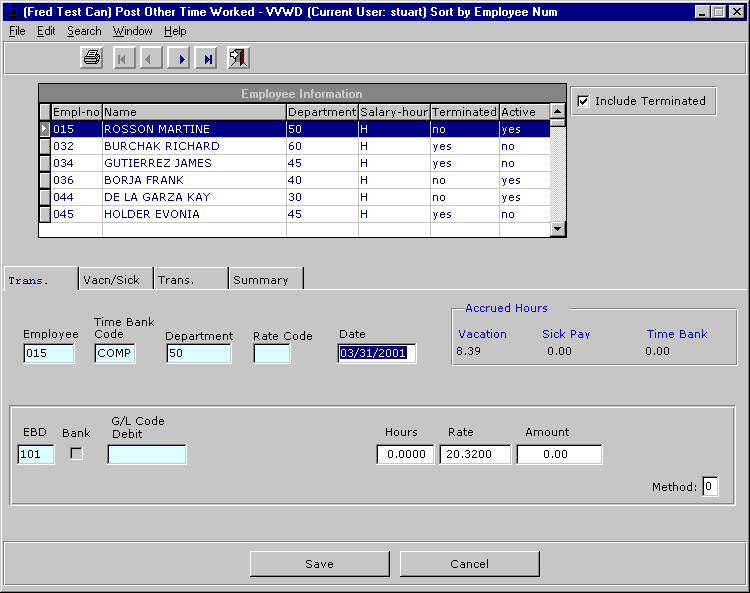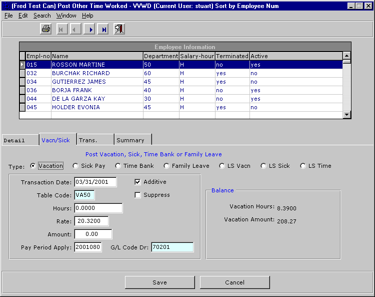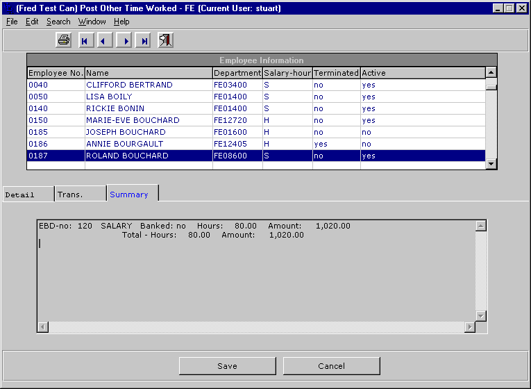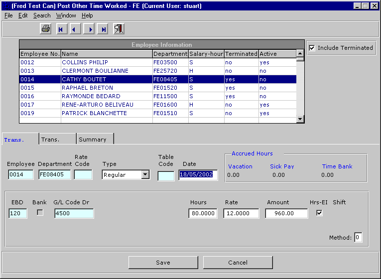 The minimum information needed to post a transaction (once an employee is chosen) are the number of hours worked. Clicking on the STORE button or hitting the F2 key will post the transaction. For more information on some of the fields see below.