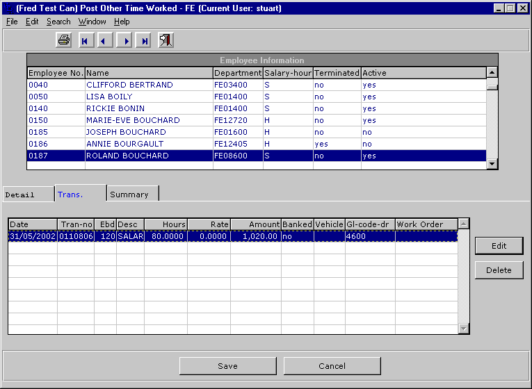 This screen allows you to view all the transactions associated with the chosen employee. To edit a transaction, highlight it and click the EDIT button.