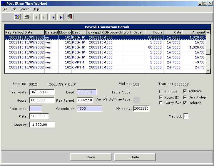 Note: When changing the Rate or Hours field please realize that the resulting Amount will only be calculated as the rate x hours notwithstanding the EBD code. So, if you are changing the value for EBD 102 (overtime) the resulting amount will not be calculated at time and a half.