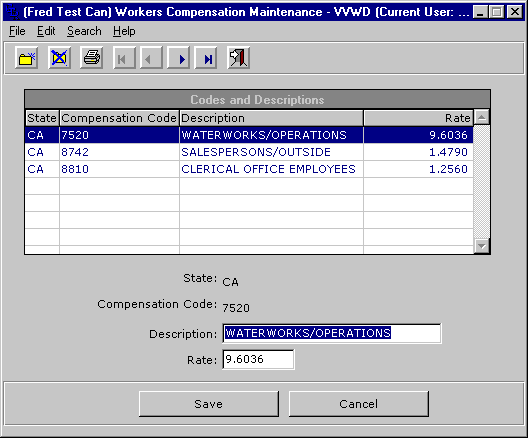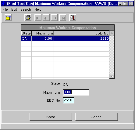 Two functions are used to record the Workers Compensation. The first screen below allows you to define the maximum allowable for each province/state. The second screen allows you to define the rate per classification within a given state/province.