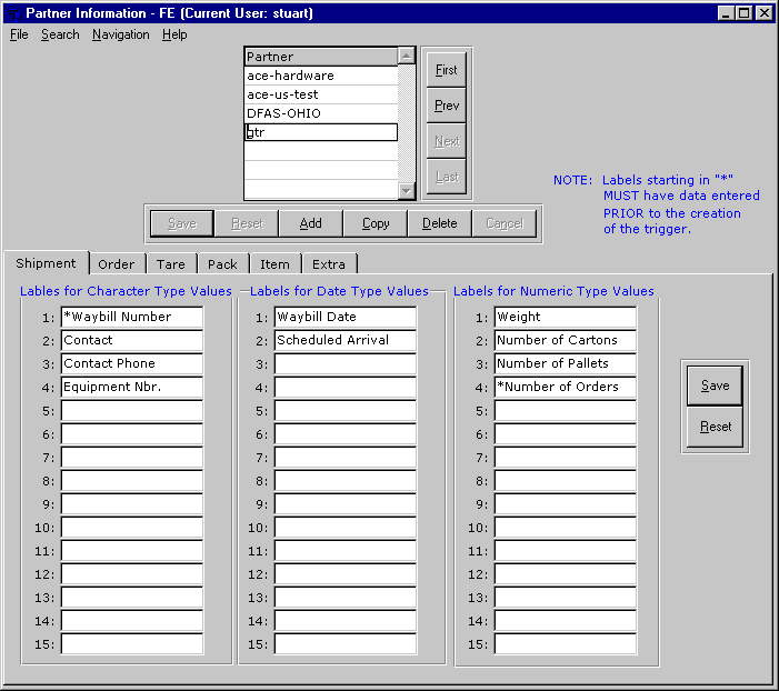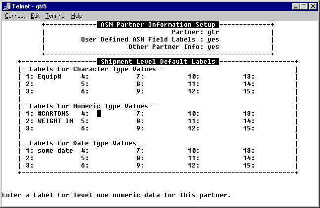 These field labels are used to provide information for the ASN that is not stored in the database. Typically these fields will be filled in at the time of shipment when their contents are known. The shipment total weight or the truck number would be examples of this type of data. The system allows for up to 15 character/numeric/date fields per ASN level. These fields are defined for each partner allowing for maximum flexibility. If a label is not used then the corresponding field will not be prompted for when creating the ASN. So if you want the system to prompt the user for input of an equipment number and total shipment weight when the ASN is created you need only create two labels (at the shipment level).