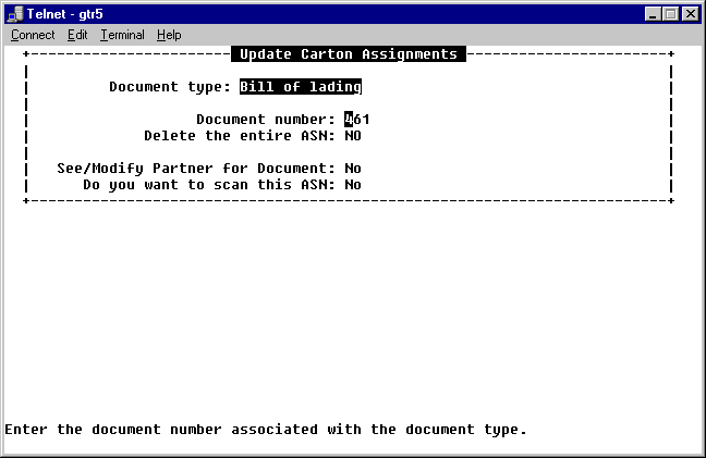 To illustrate we have created a BOL (#461) that will be shipped in 2 cartons on one pallet. The screens are presented in order of posting. An explanation is underneath each screen.