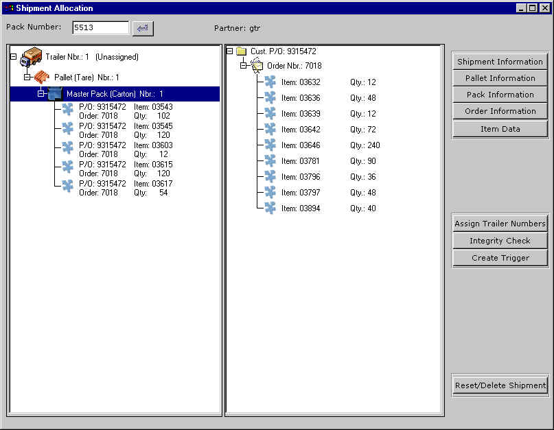 The left hand side of the screen shows the shipment as it is being assembled. The tree structure root is the shipment level, subsequent levels are the order, pallet, carton, and item. When starting the carton assignments all the items will be listed in the right window pane. You can create pallets and cartons on the left side by highlighting the level and right clicking. You will then be presented with a menu listing the options that are available at that level. For example, you can highlight a carton on the left hand side and then highlight an item (or multiple items by using shift or control clicks) and then right clicking on the item or item list. You can then transfer all or part of the items to the highlighted carton. You can also create single or multiple carton/pallets by highlighting the truck or pallet.